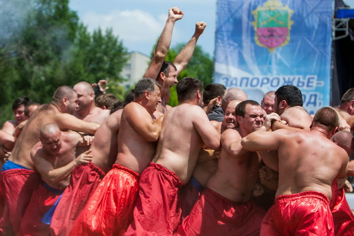 «Тот не казак, кто в лаве не стоял». Под таким девизом 8 июня на каскаде фонтанов Радуга прошли традиционные для Запорожья соревнования «Лава на лаву». 200 участников сошлись в групповом поединке на кубок князя Владимира Великого. Мероприятие, поддерживающее и развивающее украинские спортивные традиции, уже третий год подряд организовывает всеукраинская федерация казацких боевых искусств «Спас». Всеукраинский турнир проходит трижды в году. Среди неизменных фаворитов – сборные Энергодара и Днепропетровска. В этот раз с ними соревновались команды фермеров из Новоалександровки, сборная запорожского училища милиции и еще две запорожские команды. – Разрешены удары выше пояса и ниже шеи. Борьба запрещена, – объясняет правила глава всеукраинской федерации «Спас» Александр Притула. – Задача одной лавы – вытеснить другую лаву на сторону ее построения. Ближе к финалу, между сходками лавы участники соревнуются в индивидуальных поединках «крест на крест» и «на поясах». В первом случае главное повалить противника на лопатки, при этом не выпустив его пояс, во втором – не расцепить захват на спине оппонента. В столкновении с фермерами побеждает милицейское училище. Состав этой команды постоянно обновляется, ведь курсанты учатся всего 4 месяца. – На подготовку к этим соревнованиям у нас было всего 2 недели, – говорит начальник запорожского училища милиции Николай Назаренко. – Весь полученный опыт наши бойцы используют во время охраны правопорядка. В случае массовых беспорядков, или если, например, надо остановить разъяренную толпу. В каждой "лаве" – 25-30 человек. Общий вес одной из сильнейших команд – сборной Днепропетровска, превышает 3 тонны. Поддерживать форму бойцам помогает тяжелая атлетика, многоборье, бодибилдинг, силовые виды спорта. Но не последнюю роль играет и тактика. – Я вешу больше 100 килограмм, но есть, конечно, в команде ребятки и поменьше, – говорит участник соревнований из Энергодара Александр Шилов. – Главное вообще желание. В поединке приблизительно одинаковых по весу командах победить поможет дух и тактика. По итогу соревнований первое место разделили команды Энергодара и Днепропетровска. Но, как не раз акцентировали организаторы, главным в боях «Лава на лаву» является тот факт, что искусственно созданные экстремальные обстоятельства объединяют людей. Не зря каждый бой заканчивается братанием – те, кто секунду назад были заядлыми противниками, крепко обнимаются.